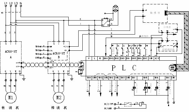 如果需要控制收線的恒定速度,則需要計算卷徑,那就是在初始卷徑的基礎上每排一層線,盤子的直徑增加2Ф,然后求出盤子繞好線的周長,用設定的線速度除以機械傳動比例系數(shù)再除以電動機的極對數(shù)等于要運行的頻率速度。